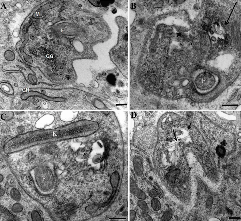 Figure 4: Transmission electron micrographs of T. dionisii epimastigotes treated with posaconazole and amiodarone (B–D). (A) Control cell with normal morphology (N, nucleus; k, kinetoplast; F, flagellum). (B) Epimastigotes treated with 1 nM posaconazole showed an intense disorganization of Golgi complex (asterisks). (C–D) Amiodarone treatment (0.5 µM) causes mitochondrial swelling (m) and membrane blebs (b) at the parasite flagellum after 48 hours.